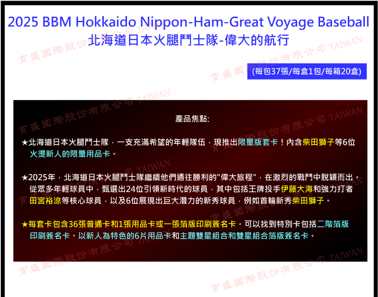 品名:【BBM】{NPB日本職棒} 2025 Hokkaido Nippon-Ham Fighters Great Voyage 北海道日本火腿鬥士隊 偉大的航行系列 棒球球員卡 (1盒)