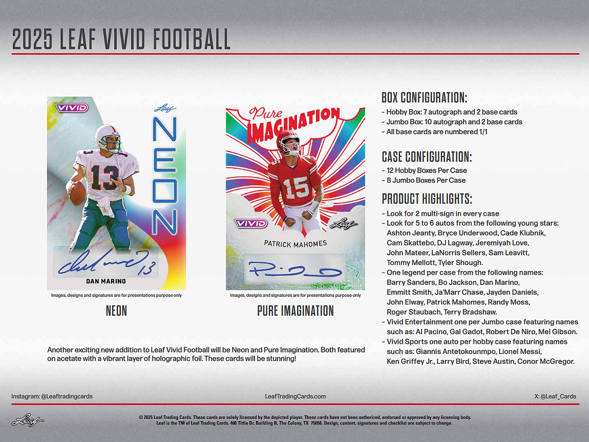 【LEAF】{NFL美式足球} 2025 Vivid Football Jumbo 鮮豔生動系列 Jumbo盒 美式足球球員卡 (1盒1包,每包12張入)
