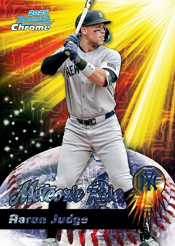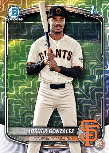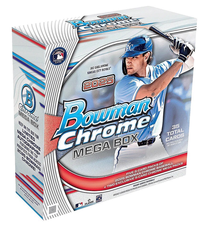 Mojo Refractors魔幻亮聞名,今年的 Mega Box 版本將為收藏者提供5包傳統的 Bowman Chrome卡包和2包獨家的 Mojo Refractors魔幻亮卡包。這些卡片包含2025 Bowman Chrome系列的部分基本卡、特卡和簽名。